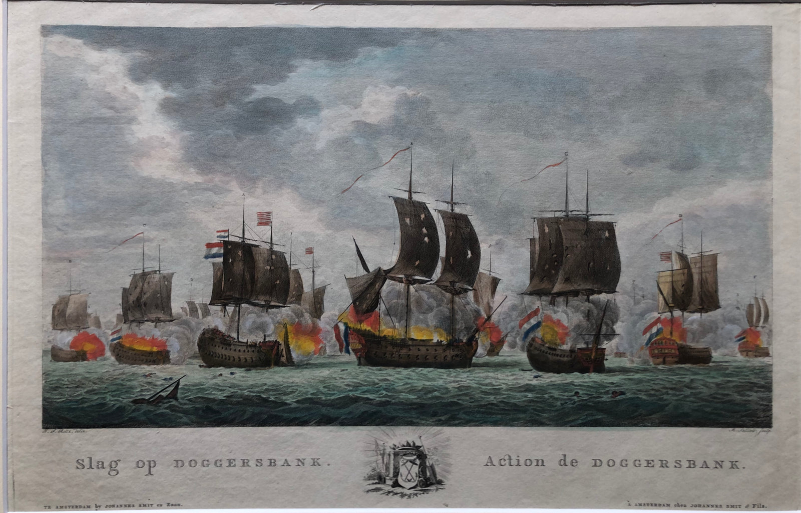 'Slag op Doggersbank – Actie de Doggersbank'. Fraai gravure gravure van de slag tijdens de Vierde Engelse Oorlog. Door M. Sallieth naar JF Reitz. Uitgever: Johannes Smit en Zoon. 1781.